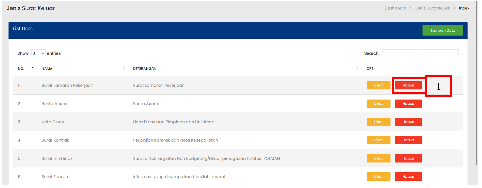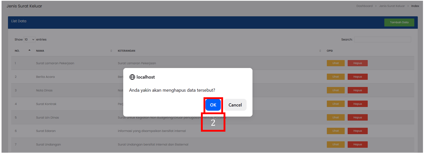 Pilih tombol Hapus pada baris data Jenis Surat Keluar yang ingin dihapus |