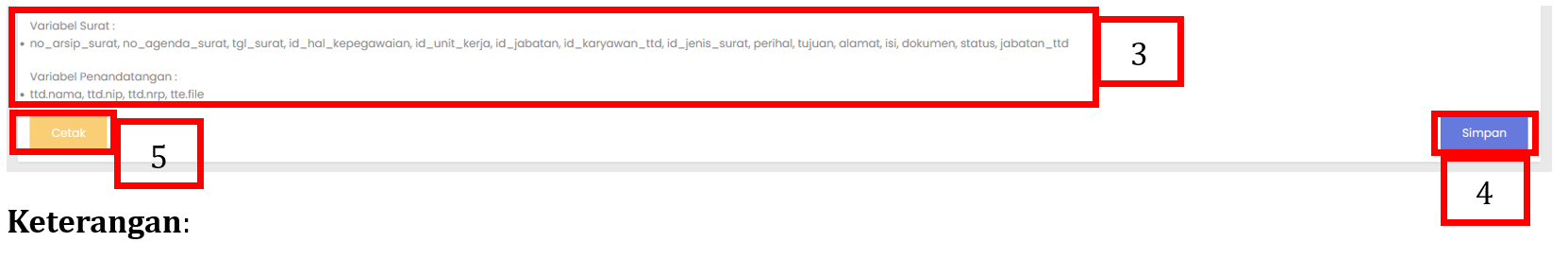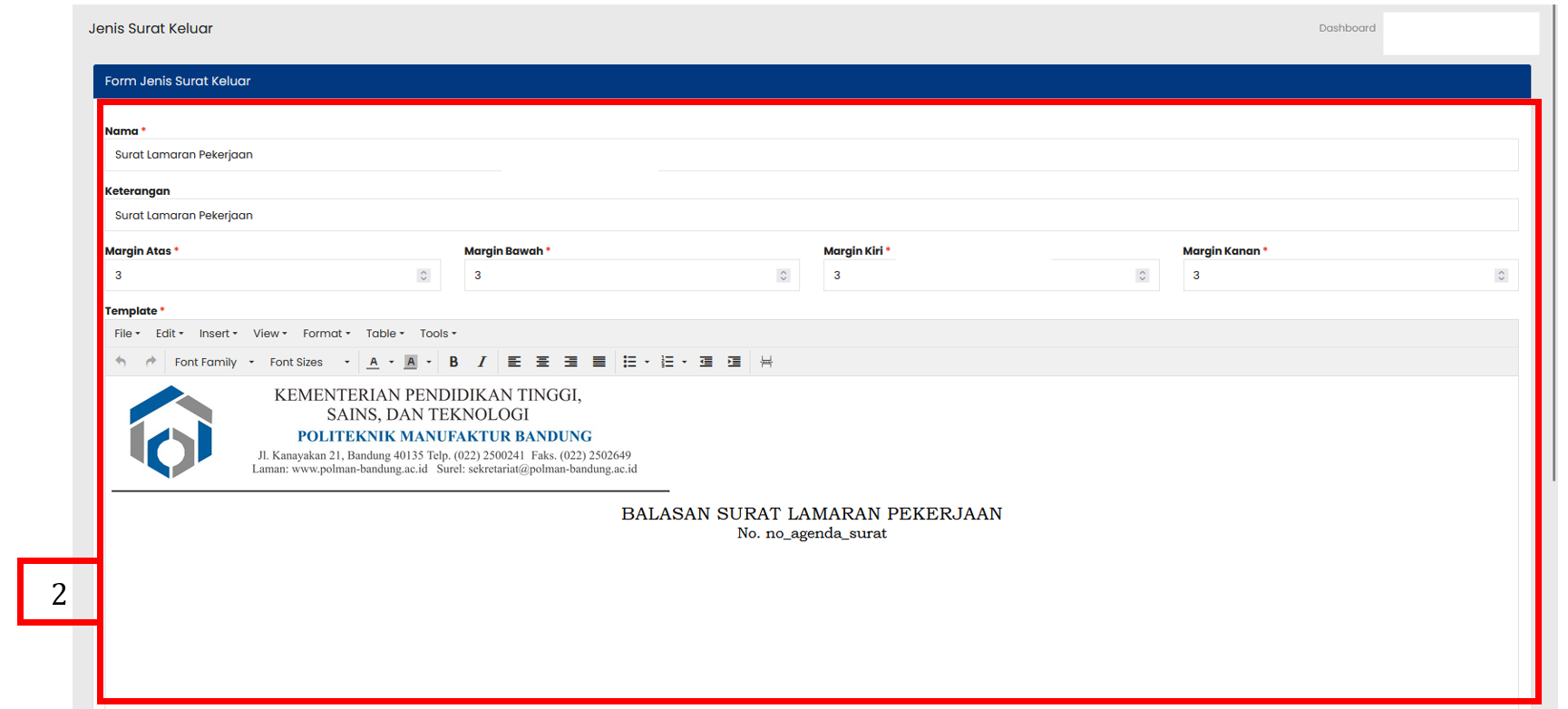 Isi form penambahan data sesuai dengan informasi Jenis Surat Keluar yang dibutuhkan. Nama : Isi dengan nama atau judul jenis surat keluar. Contoh: Surat Tugas, Surat Pernyataan, Surat Undangan Keluar. Keterangan : Berikan deskripsi singkat mengenai penggunaan jenis surat tersebut. Margin Atas : Tentukan jarak margin bagian atas pada template surat Margin Bawah : Tentukan jarak margin bagian bawah pada template surat Margin Kiri : Isi dengan ukuran margin sisi kiri dokumen. Margin Kanan : Isi dengan ukuran margin sisi kanan dokumen Template : Isi template surat menggunakan text editor yang telah disediakan. |