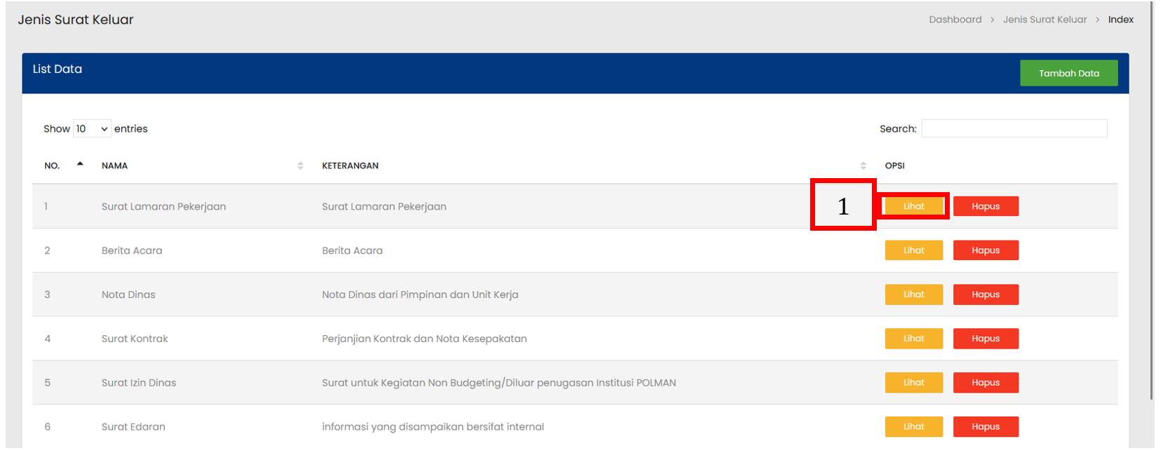 Pilih tombol Tambah Data untuk menampilkan form penambahan Jenis Surat Keluar baru |