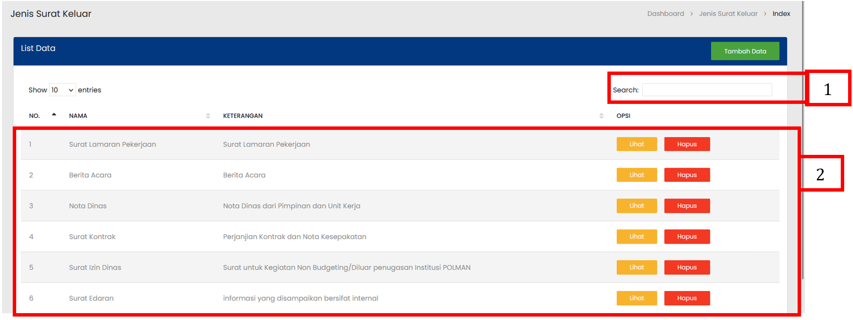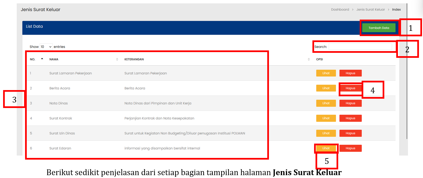 Tabel Jenis Surat Keluar menampilkan daftar seluruh Jenis Surat Keluar yang sudah terdaftar |