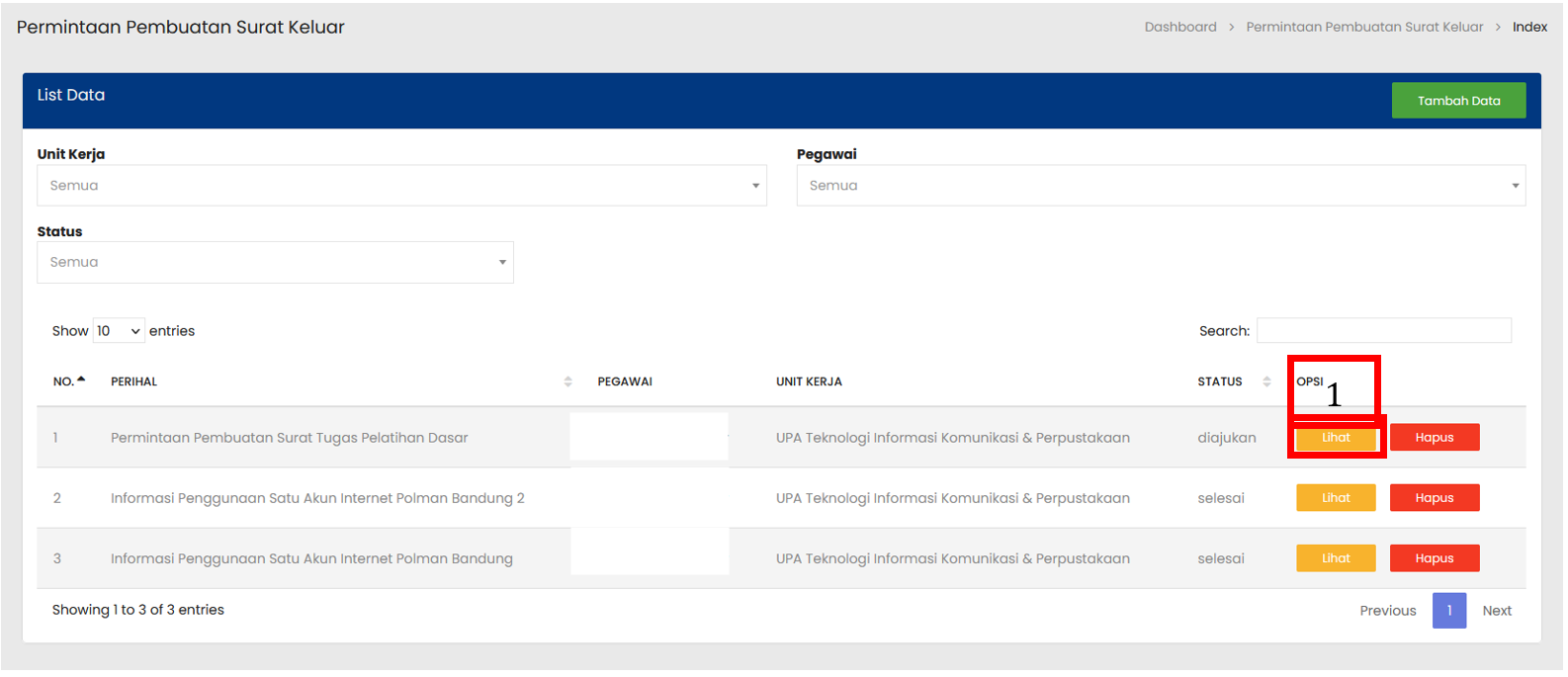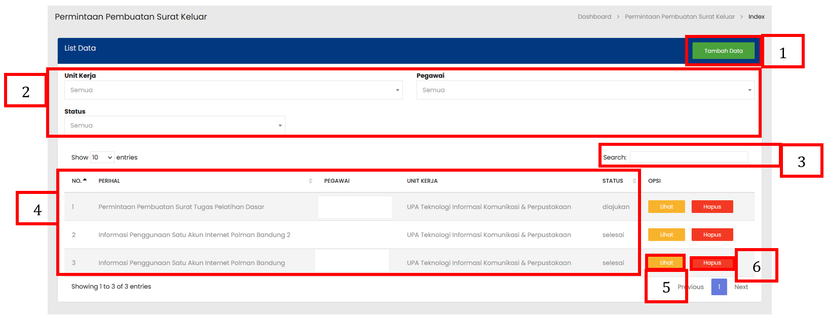Tabel Permintaan Pembuatan Surat Keluar menampilkan daftar seluruh Permintaan Pembuatan Surat Keluar yang sudah terdaftar |