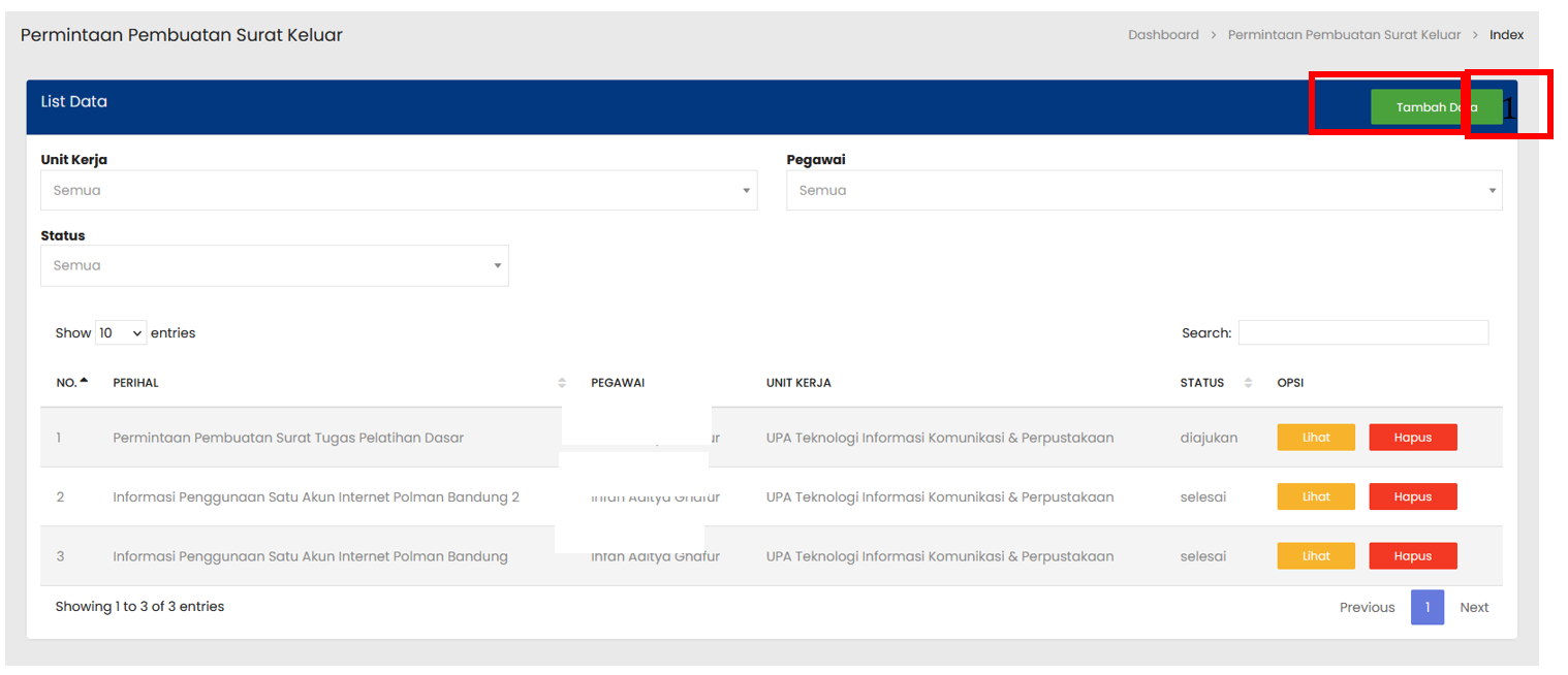 Pilih tombol Tambah Data untuk menampilkan form penambahan permintaan pembuatan surat keluar |