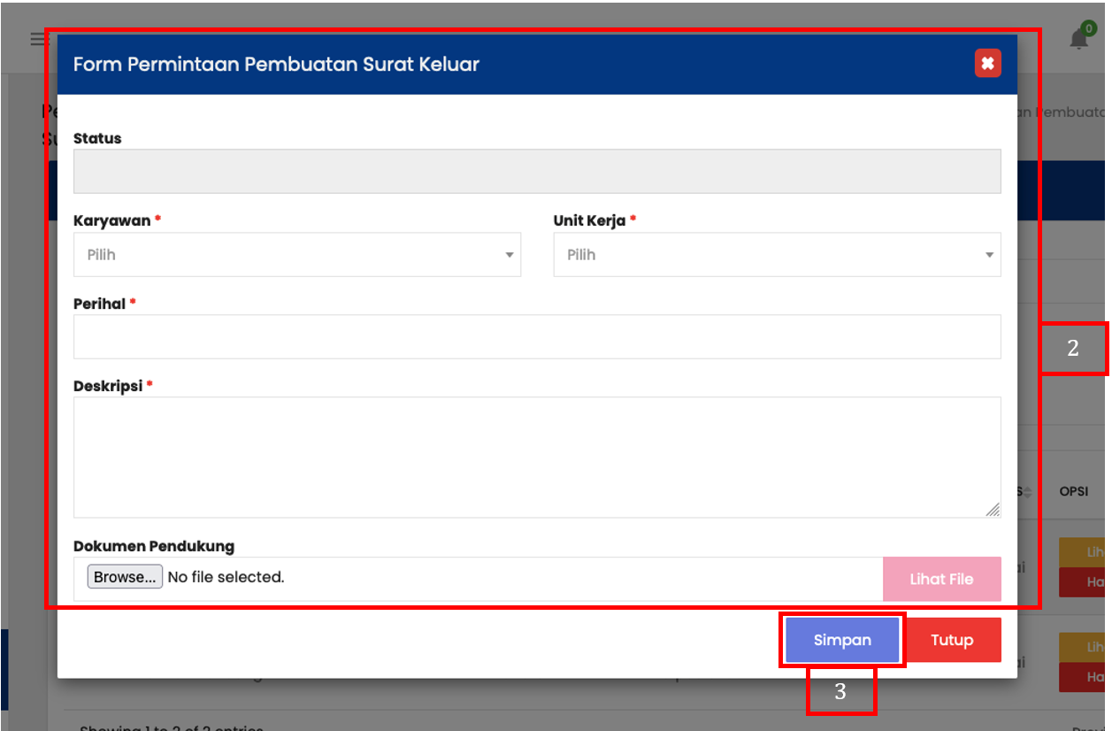 Isi form penambahan data sesuai dengan informasi permintaan pembuatan surat keluar yang dibutuhkan. Status : otomatis terisi dengan status “Diajukan” dan tidak dapat diubah (disable). Karyawan : diisi dengan nama karyawan yang mengajukan surat. Unit Kerja : diisi dengan unit kerja dari karyawan pengaju surat. Perihal : judul atau topik dari surat yang akan dibuat. Deskripsi : penjelasan singkat mengenai isi atau tujuan surat. Dokumen Pendukung : unggah dokumen tambahan yang mendukung |
