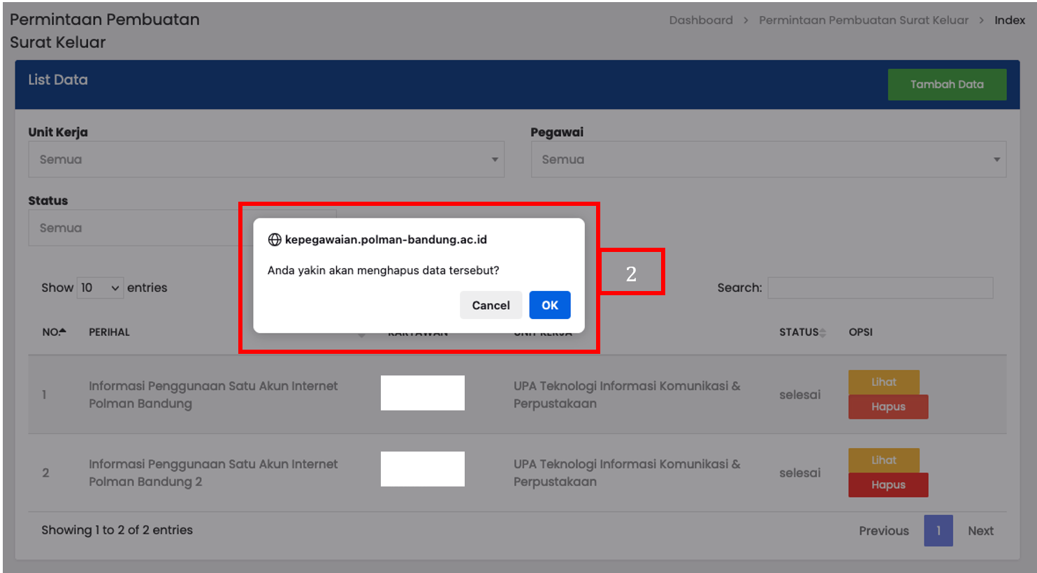 Pilih tombol OK pada pop-up konfirmasi untuk menyetujui penghapusan data |