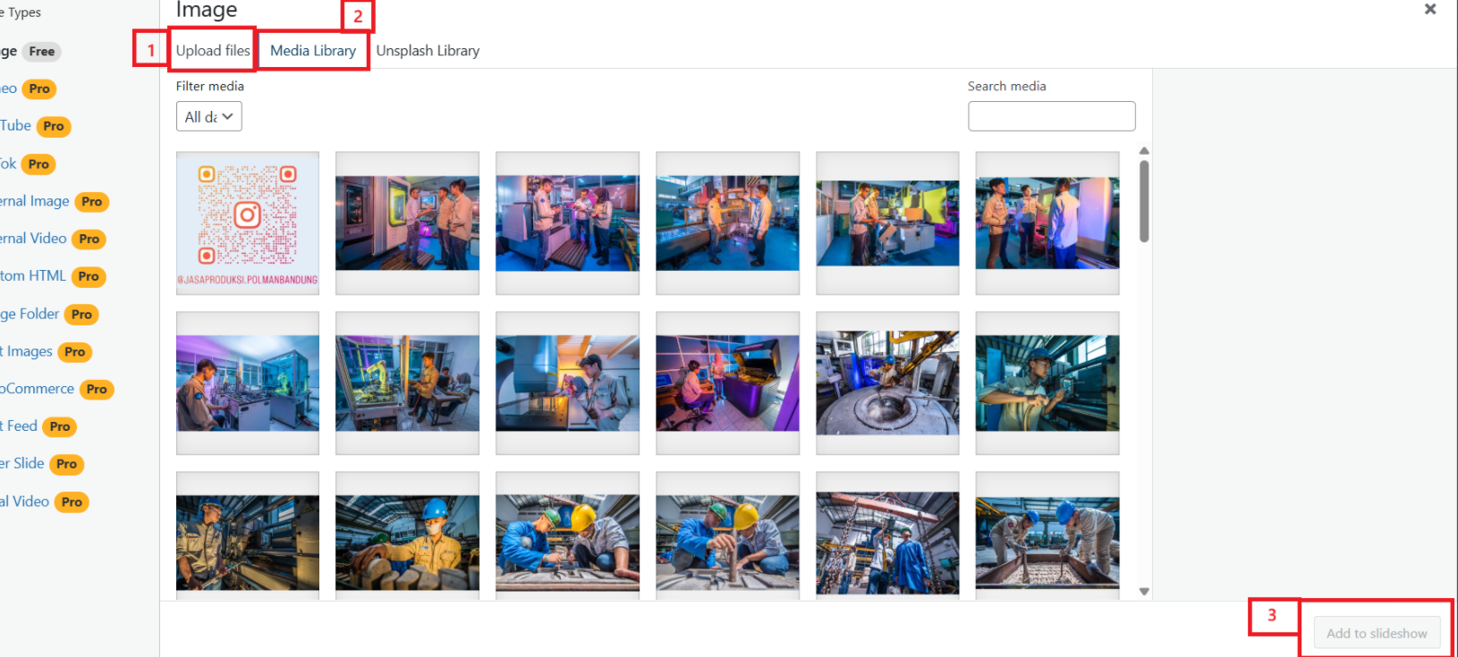 Tombol "Media Library" untuk menggunakan gambar yang sudah diunggah sebelumnya